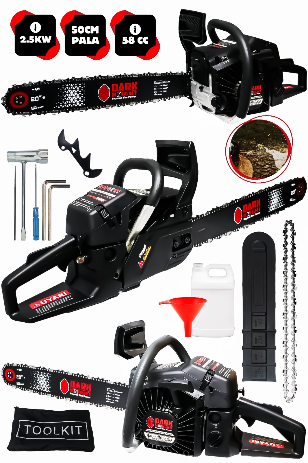 Murcell Darknight 58cc benzinli testere, 2.5 kW motor gücü sayesinde kalın ağaç gövdelerinde bile hızlı ve etkili kesim performansı sunar. 50 cm pala uzunluğu ile geniş çaplı odun ve ağaç kesim işlemlerinde yüksek verim sağlar.