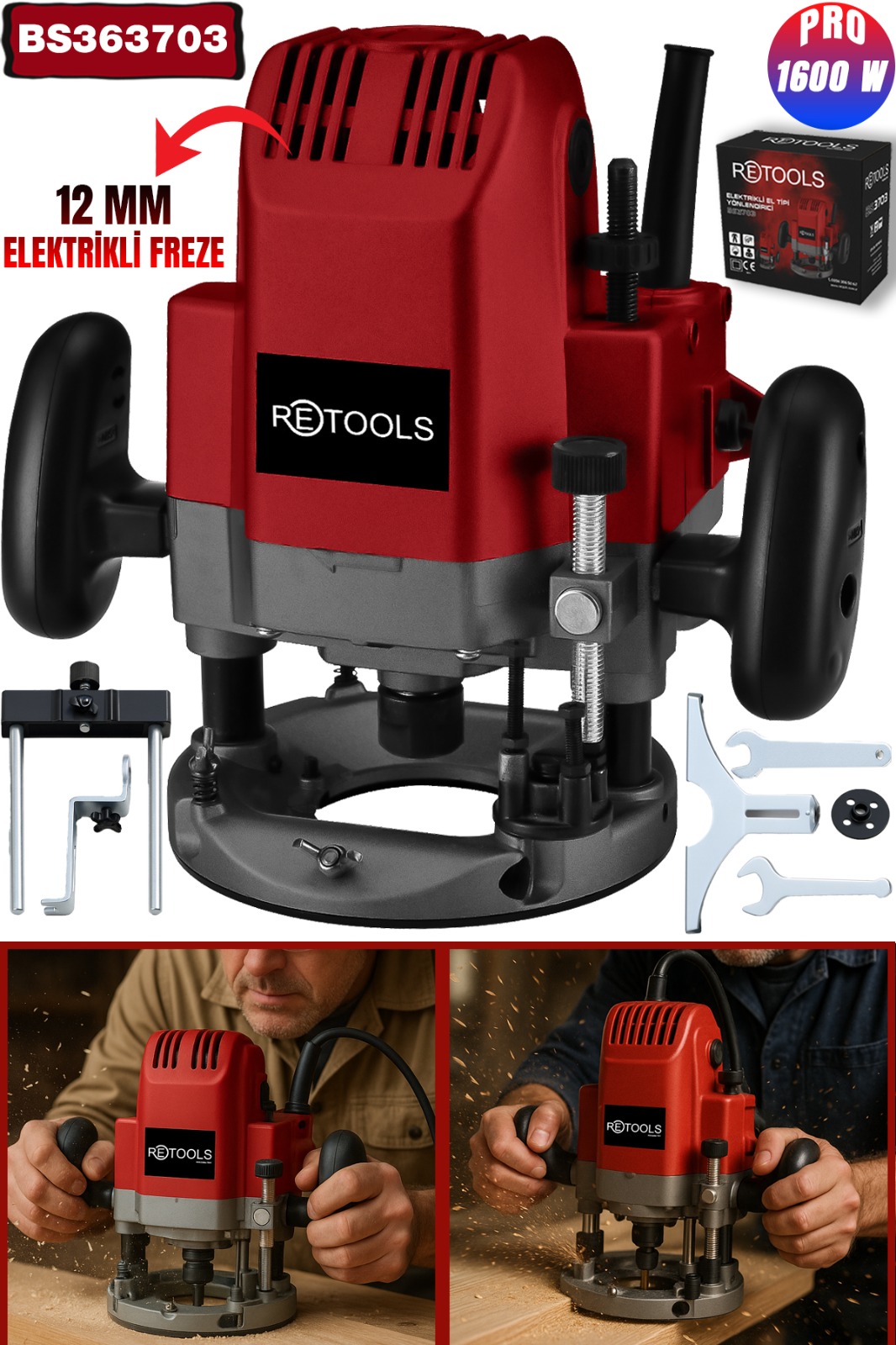 Retools Bordo 12 mm Çift Kollu Freze, ahşap, MDF ve benzeri yüzeylerde profesyonel kesim, kanal açma ve şekillendirme işlemleri için tasarlanmış güçlü bir freze makinesidir. Çift kollu ergonomik yapısı sayesinde yüksek kontrol ve hassas çalışma imkânı sunar.