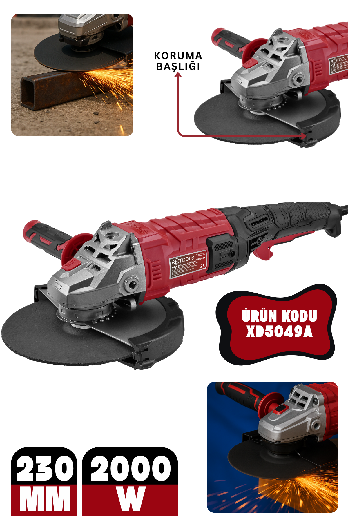 RETOOLS XD5049A 230 mm 850W Avuç Taşlama, metal, taş, beton ve seramik yüzeylerde kesme ve taşlama işlemleri için geliştirilmiş güçlü bir elektrikli el aletidir. 230 mm büyük disk çapı sayesinde geniş yüzeylerde hızlı ve etkili kesim yapılabilir.