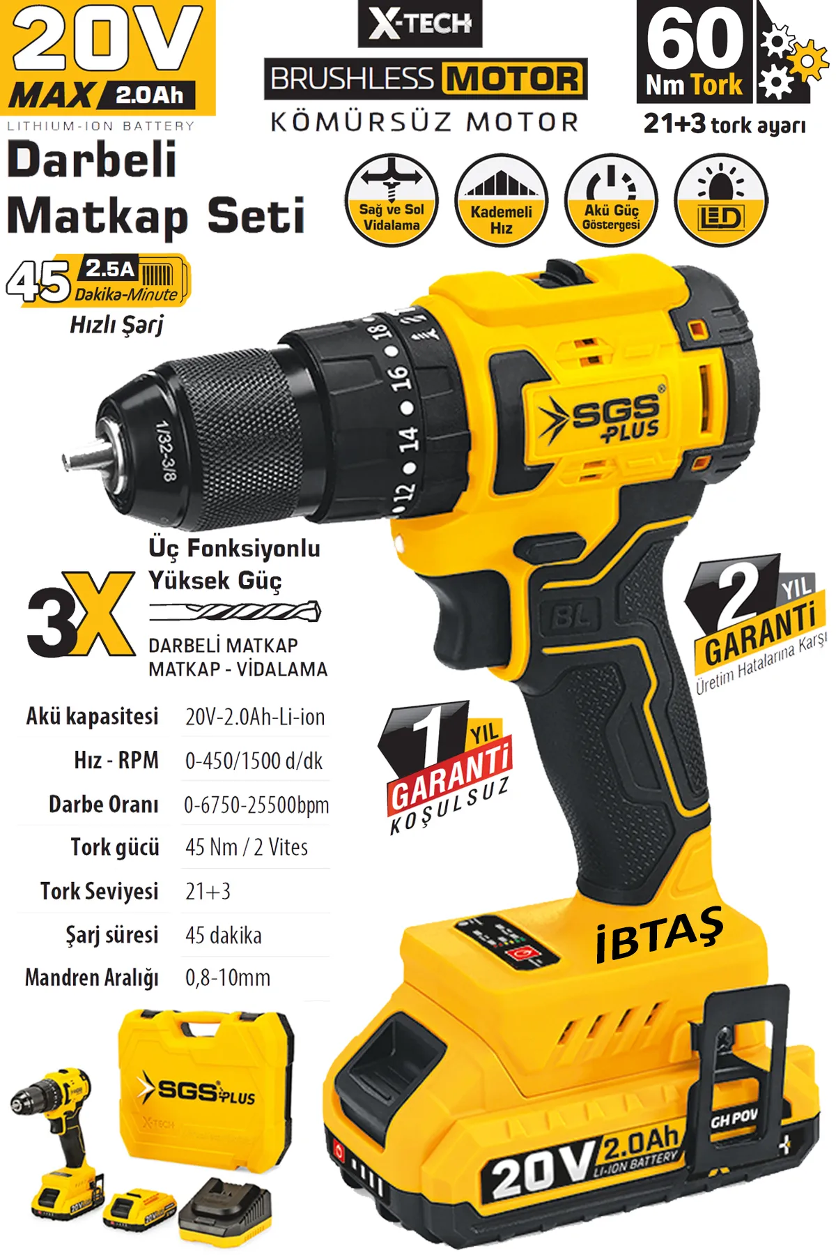 SGS AKÜLÜ DARBELİ MATKAP SETİ 20V 60NM TORK 2*2.0AH (KÖMÜRSÜZ MOTOR)